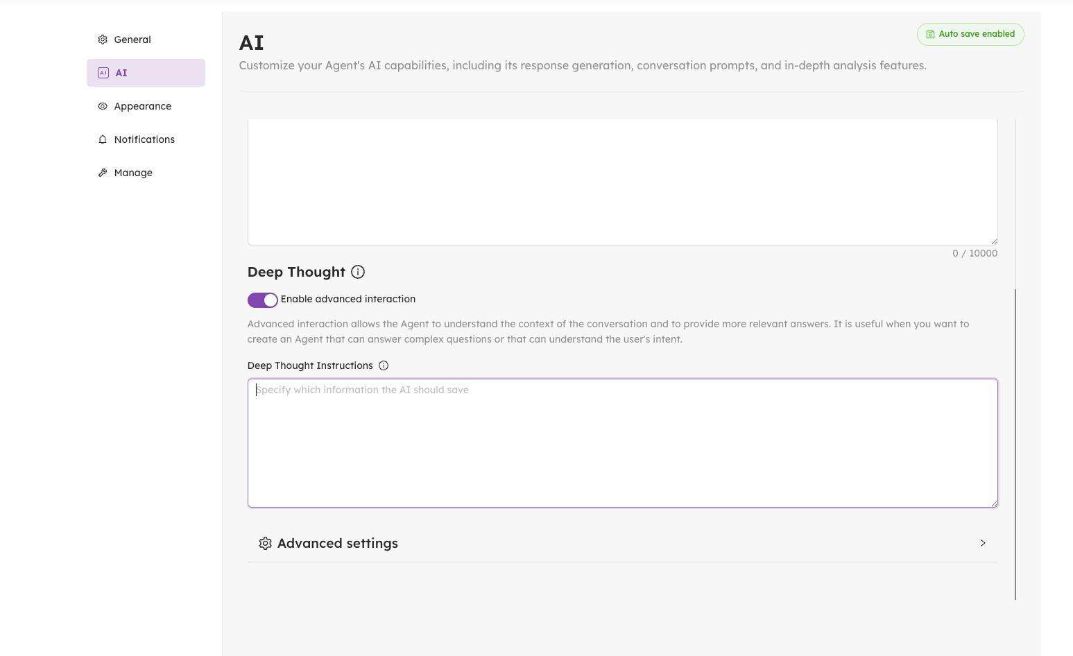 When the Deep Thought is enabled, you'll now find a new text field in the AI tab for Deep Thought specific instructions that will let you guide the AI on what to remember about your users during conversations.