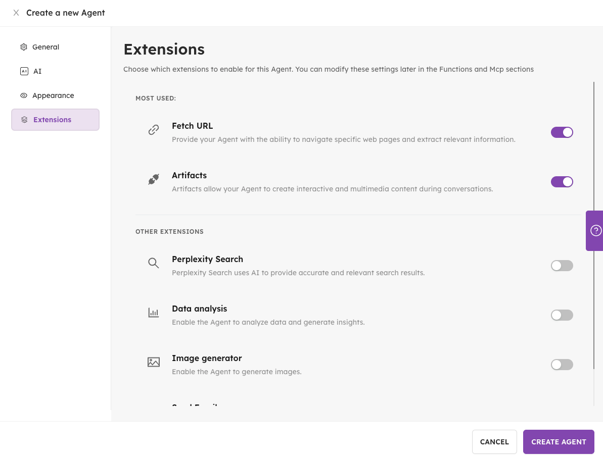In the creation form, there is a new "Extensions" tab that allows you to automatically activate presets for Functions and MCPs.